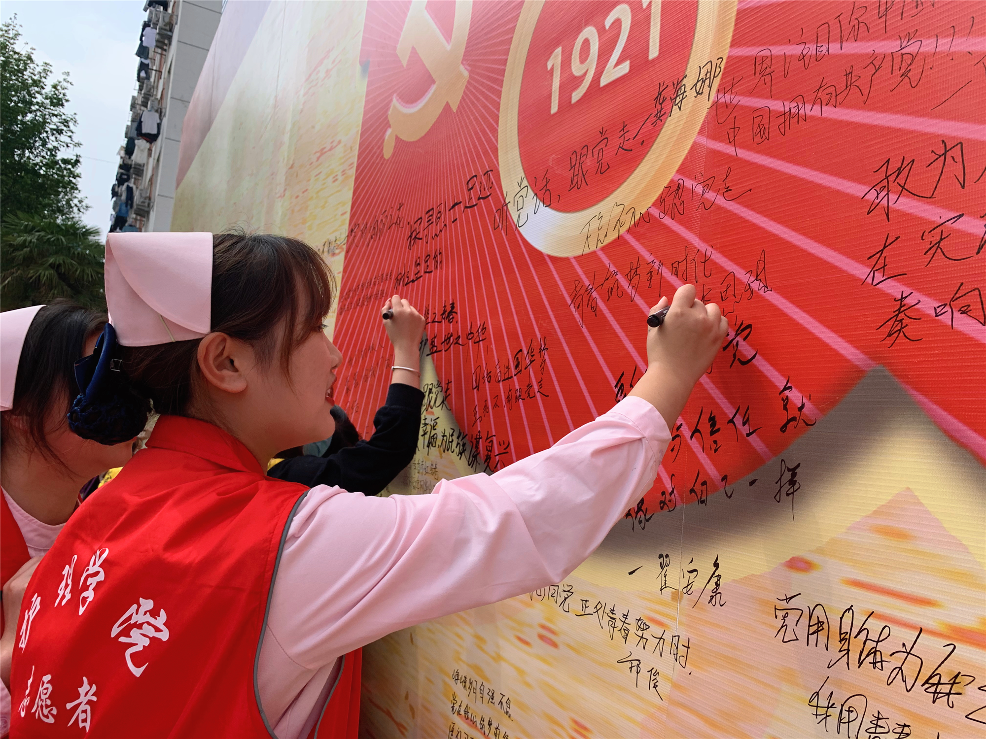 活动伊始,校党委副书记朱东方同志致辞表达对党百年奋斗的敬佩之情。随后同学们纷纷在寄语墙上写下自己的名字以及对党的深深祝福:“百年大党,风雨兼程,不忘初心谋复兴”;“为天地立心,为生民立命,为往圣继绝学,为万世开太平”;“牢记党恩砥砺行,今日我辈皆楷模,明日必为栋梁乎”……一句句深情的寄语流淌在签字笔尖,祝福党的百年复兴;一句句语句饱含了应院师生对党的深深热爱和恒久祝福。