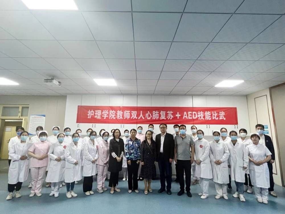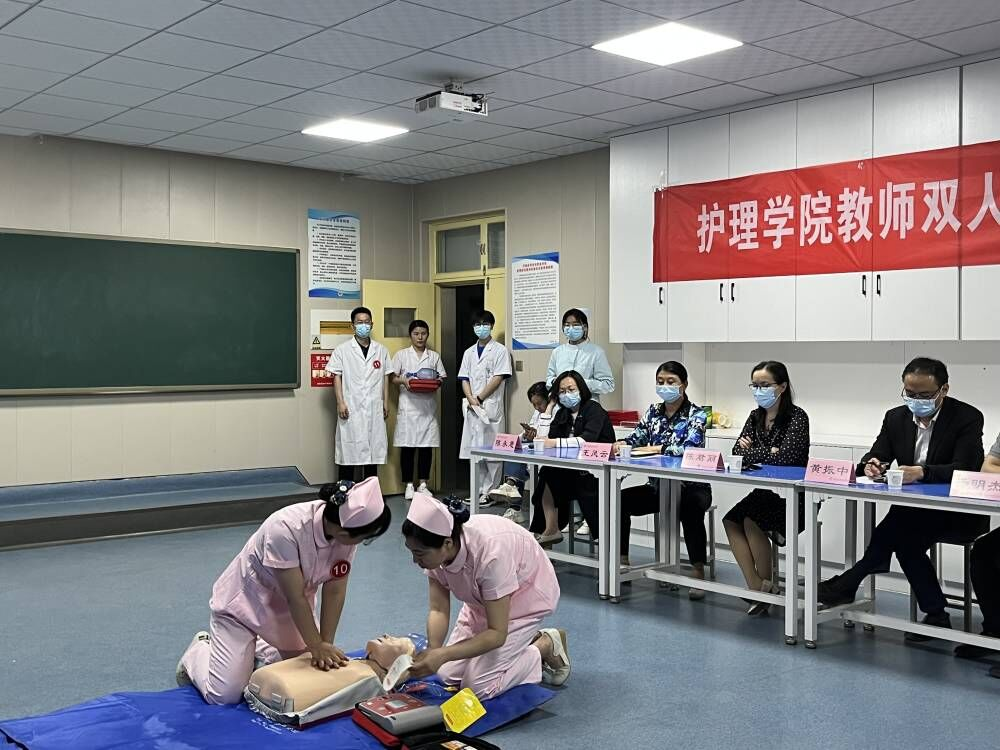 为贯彻全国职业教育大会精神,深化职业教育教学改革,进一步提升今年会jinnianhui教师职业能力和工作水平,4月27日下午,今年会jinnianhui在护理实训楼D404开展教师双人心肺复苏+AED技能比武。比赛特邀校外相关领域3位专家担任线上评委打分,副校长陈君丽、教务处处长黄振中、今年会jinnianhui党总支书记杨明杰、今年会jinnianhui院长王风云、副院长陈永惠现场观摩比赛。