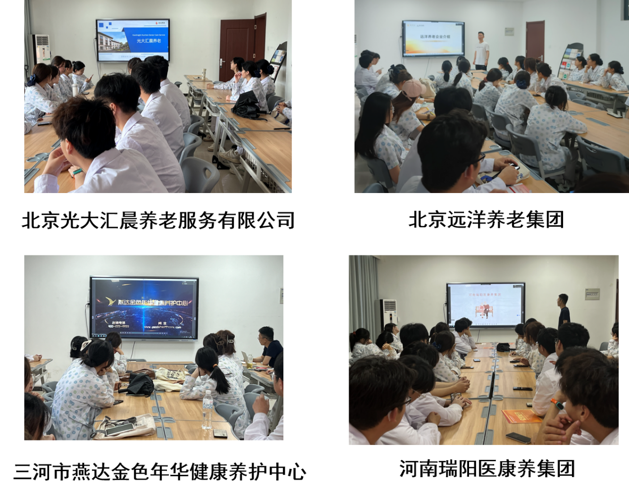 本次宣讲会由北京光大汇晨养老服务有限公司、北京远洋养老集团、三河市燕达金色年华健康养护中心以及河南瑞阳医康养集团四家合作单位企业线上宣讲。这些企业在老年保健与管理领域均有着丰富的经验和卓越的成就,为学生们提供了宝贵的实习和就业平台。