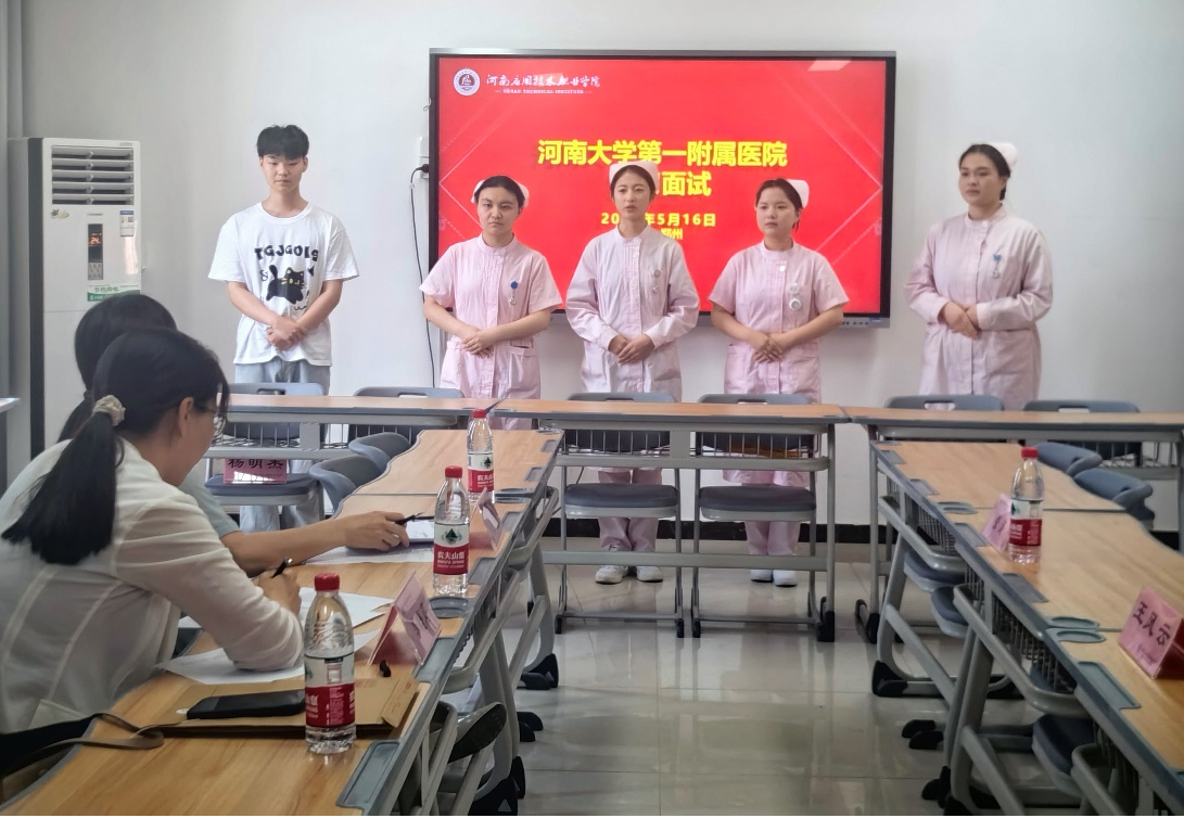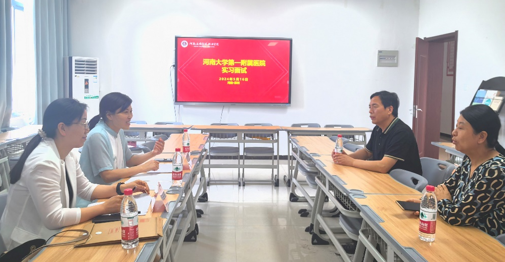 为促进高质量实习,5.16日,河南大学第一附属医院护理部关锐主任、护理部干事李晓莉老师来我校今年会jinnianhui选拔2024年护理专业实习生。面试对象为2022级护理专业的学生。