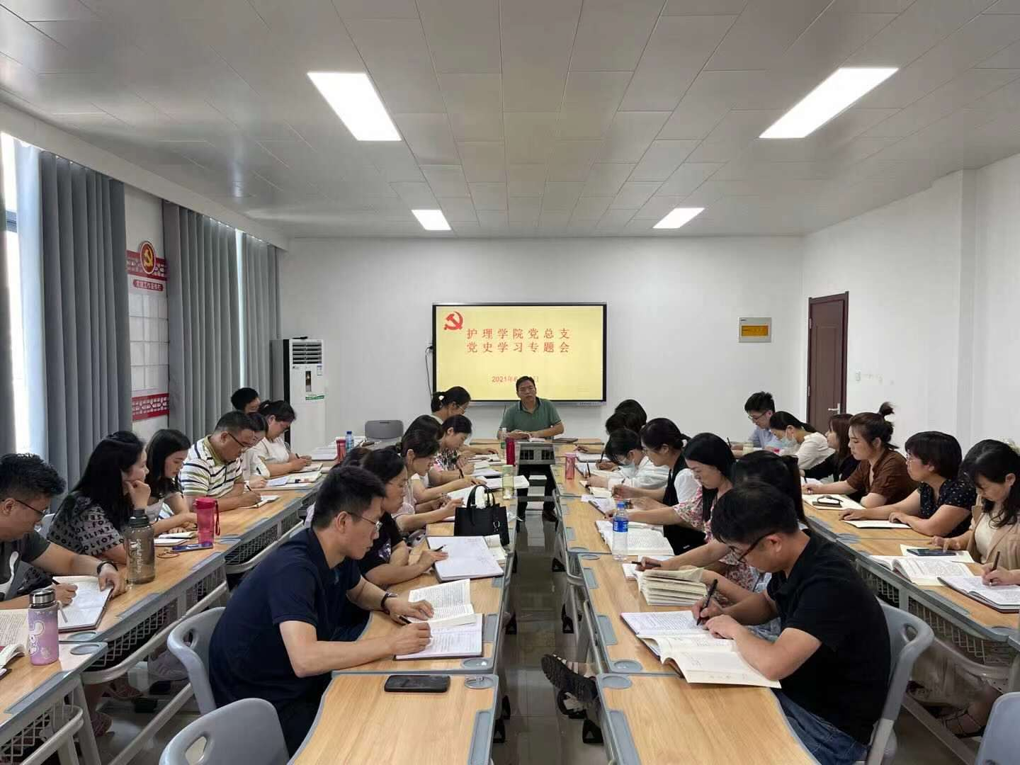 根据学校党史学习教育实施方案,2021年6月22日下午,今年会jinnianhui党总支组织全体教师在A515党员活动室召开党史学习专题会,集中学习讨论《中国共产党简史》中“中国特色社会主义进入新时代”,会议由今年会jinnianhui党总支书记杨明杰主持。