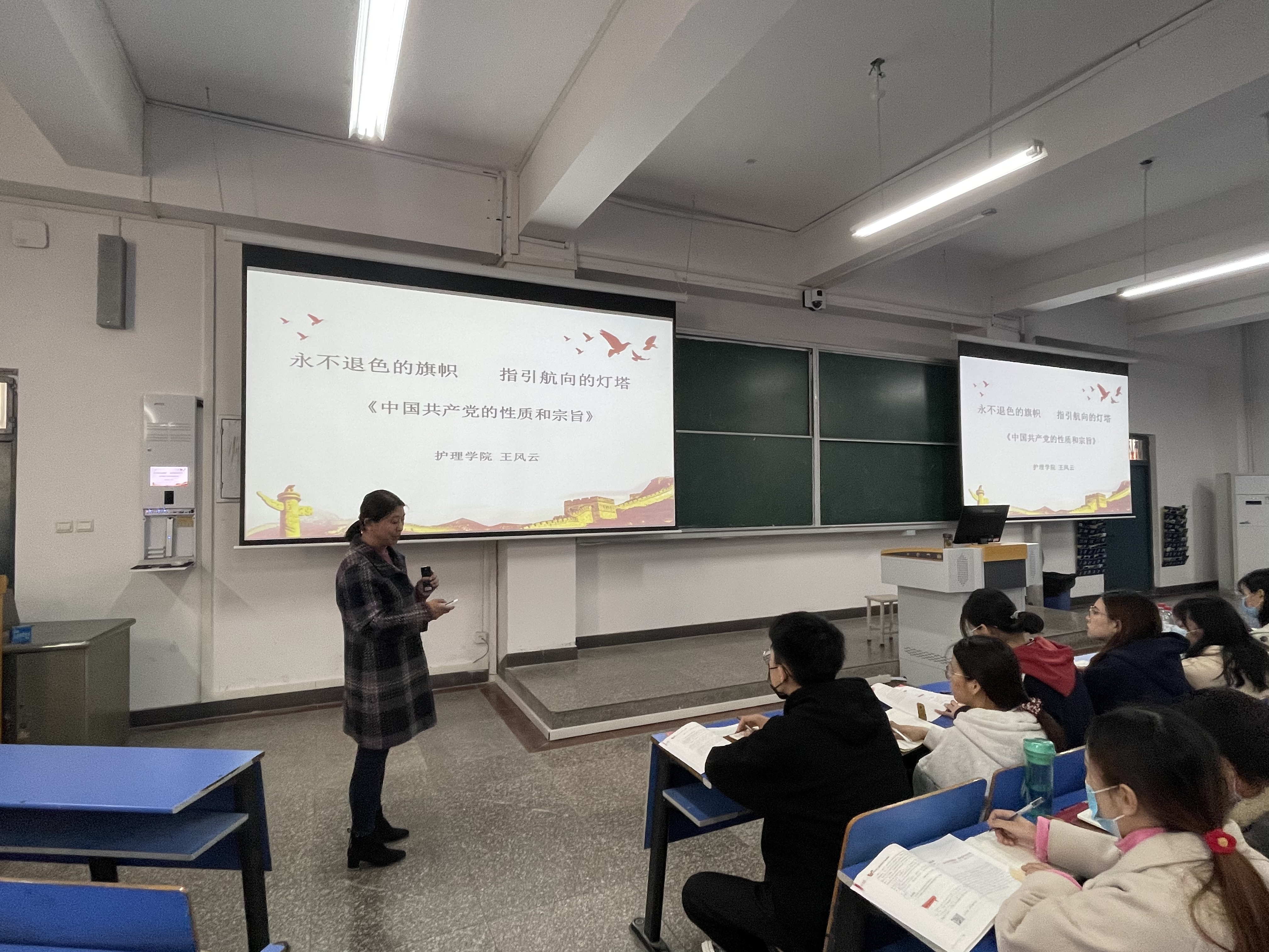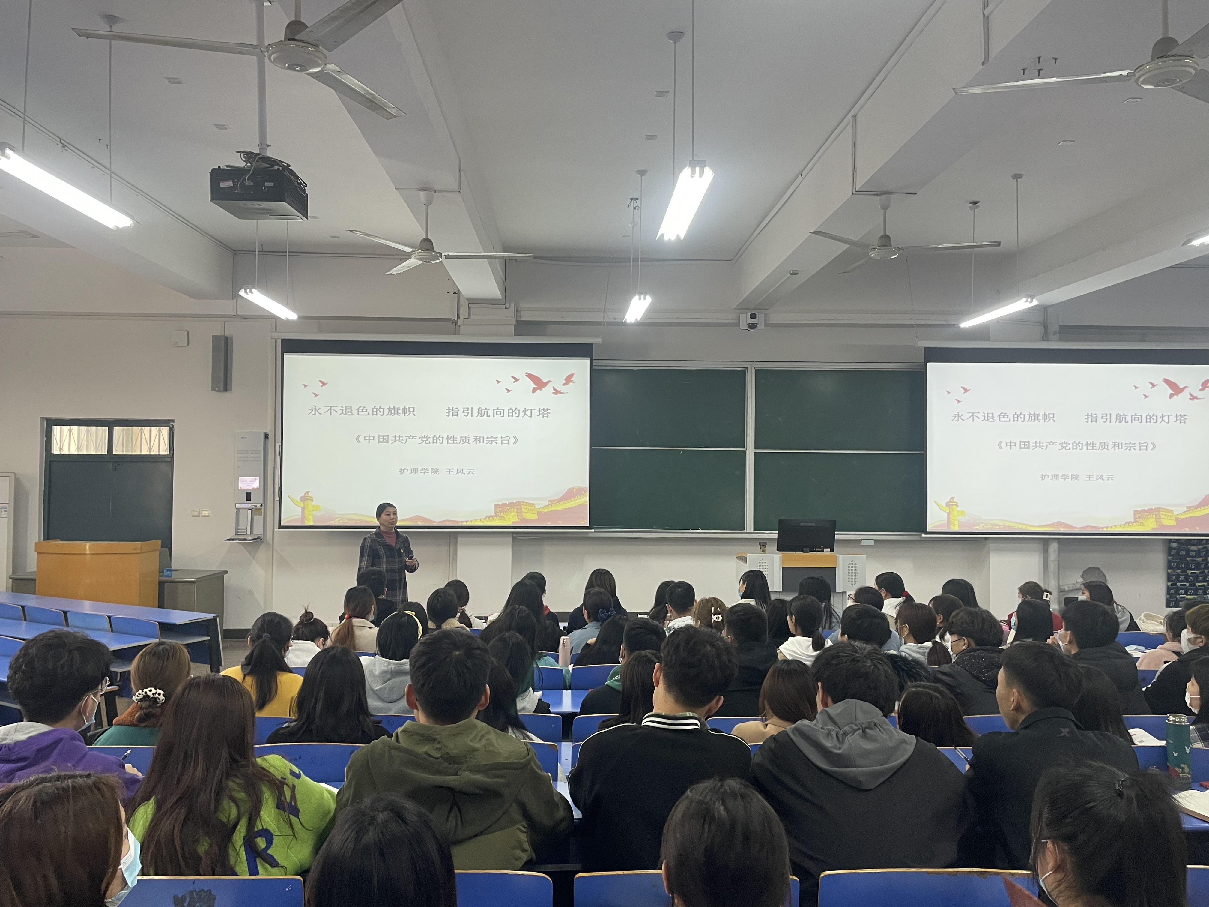 党课以《永不褪色的旗帜,指引航向的灯塔》为主题,内容以党的性质,党的宗旨,党的基本路线为主线,指出全心全意为人民服务,是党一切工作的出发点和落脚点,是党的根本宗旨。人民立场是党的根本立场,要坚持党的群众路线,坚持以人民为中心,才能在中国特色社会主义道路上奋勇前进。并要求学员们增强入党的自觉意识,提高理论水平,端正入党动机,坚定理想信念。