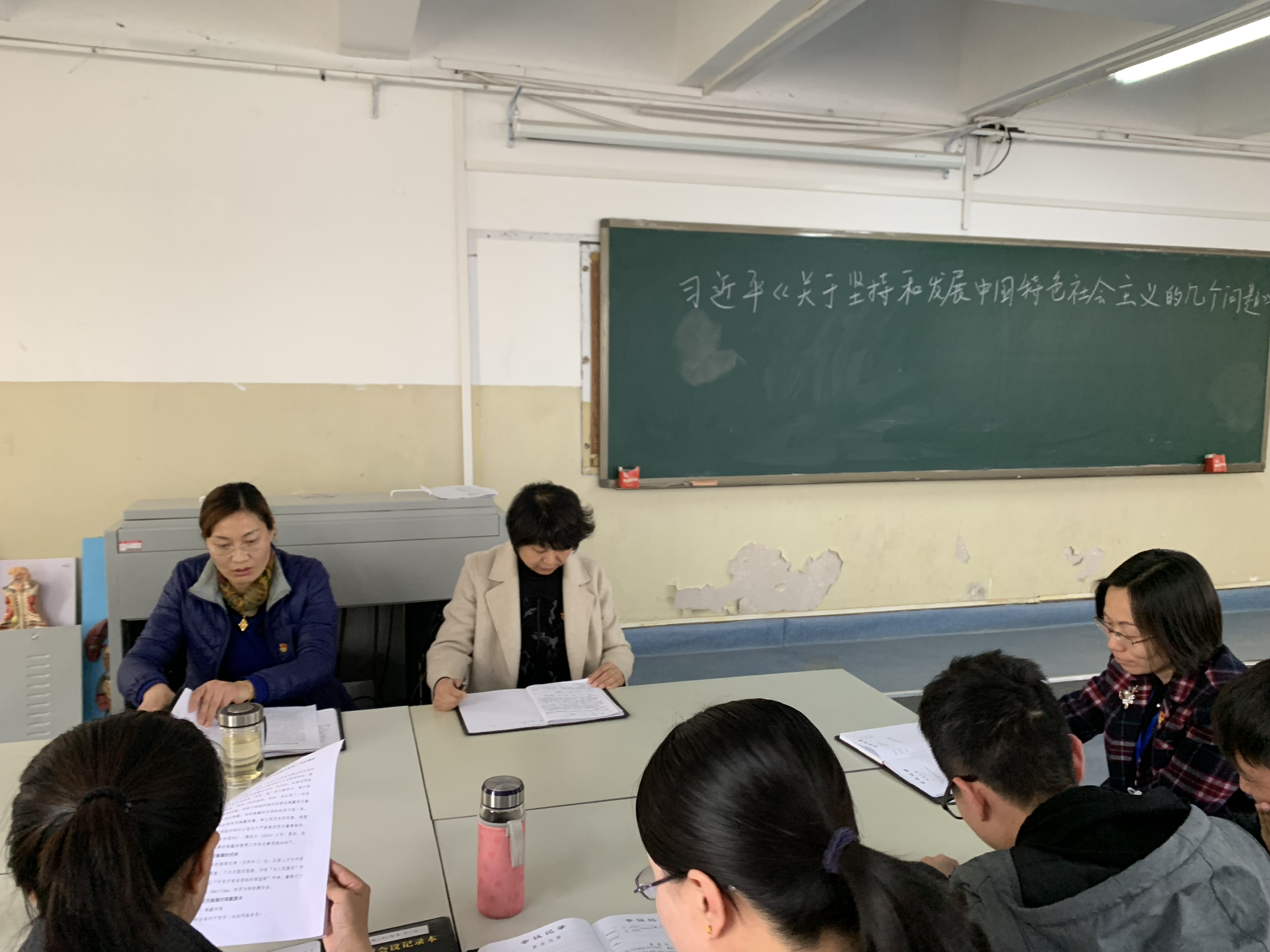 2019年4月9日下午,今年会jinnianhui全体教职工在D207召开会议,重点学习了《关于坚持和发展中国特色社会主义的几个问题》和《提升网络意识形态领域风险防范化解能力》。徐娟书记指出要认真学习领会习近平总书记重要讲话精神,领会习近平总书记提出的要求,深刻把握其中内涵,体会贯穿其中的坚定信仰和增强网络忧患意识,提高防控能力。
