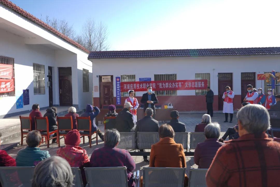 为深入贯彻落实党的十九届六中全会精神,扎实开展党史学习教育,推动新时代文明实践志愿服务走深走实,引导和帮助乡村老年人树立健康和急救意识,2021年12月3日上午,河南应用技术职业学院组建优秀的师生志愿者服务团队,在桐柏县文明办及淮源镇相关领导的带领下来到鸿仪河乡,为乡村老年人开展“我为群众办实事”义诊志愿服务。