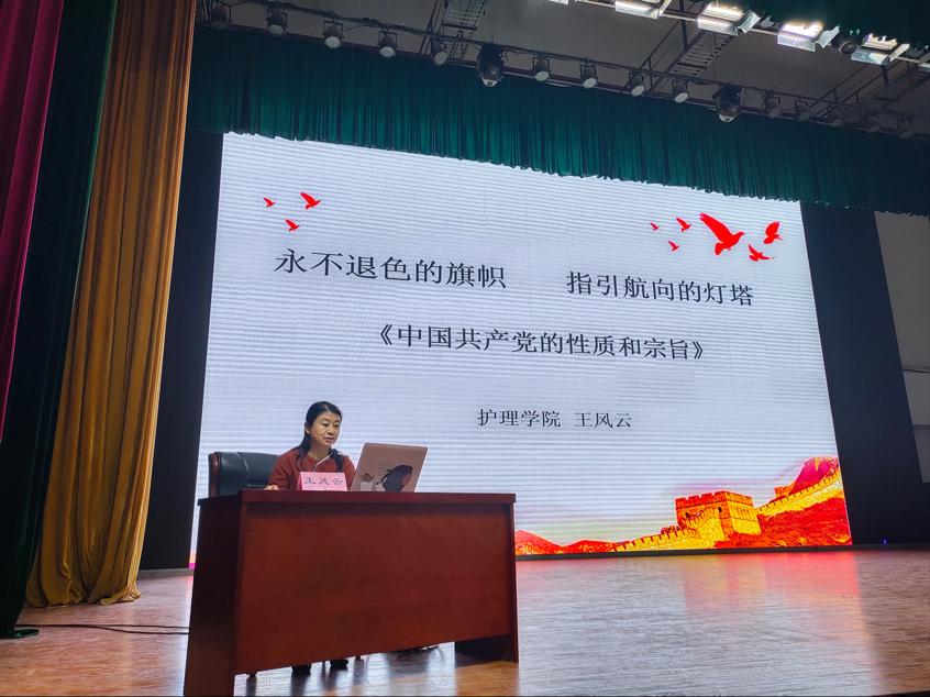 党课以《永不褪色的旗帜,指引航向的灯塔》为主题,内容以党的性质,党的宗旨,党的基本路线为主线,指出全心全意为人民服务,是党一切工作的出发点和落脚点,是党的根本宗旨。人民立场是党的根本立场,要坚持党的群众路线,坚持以人民为中心,才能在中国特色社会主义道路上奋勇前进。并要求学员们增强入党的自觉意识,提高理论水平,端正入党动机,坚定理想信念。