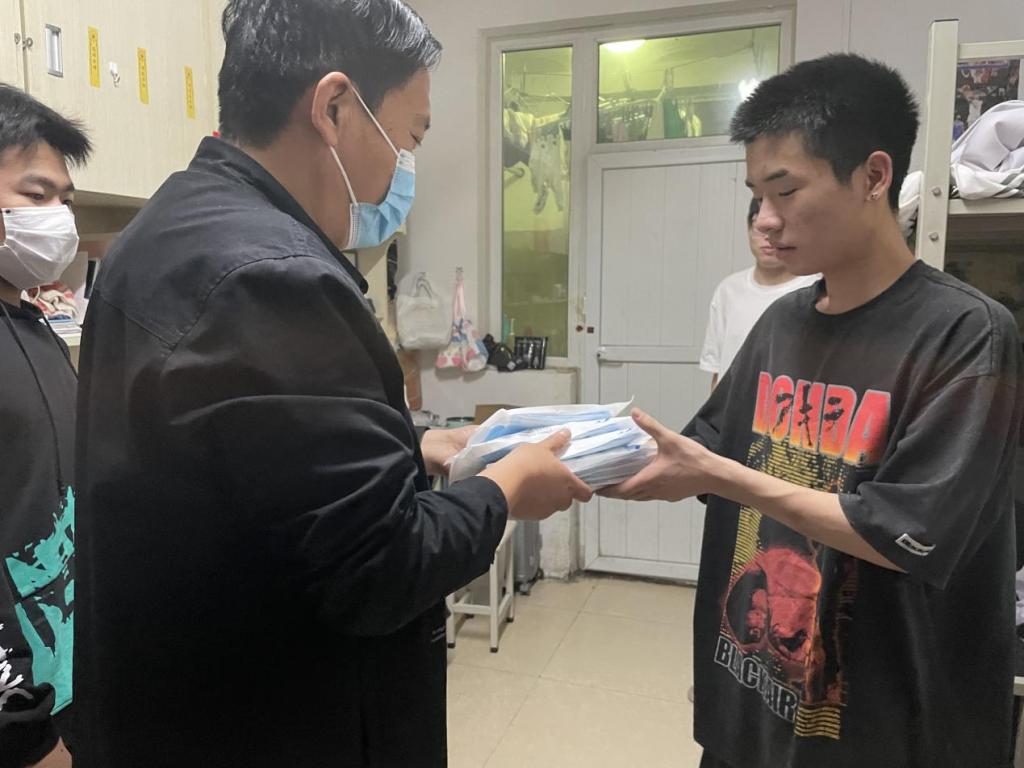 在口罩发放过程中,杨明杰书记把学校疫情防控要求和学校对学生的关心关怀传达给同学们。学生们收到暖心口罩,感受到了学校的温暖。同时,强调在疫情防控形势严峻的背景下,要严格遵守疫情期间校园管理要求,叮嘱学生做好自我防护,勤通风,注意保持个人卫生并及时消除宿舍安全隐患。
