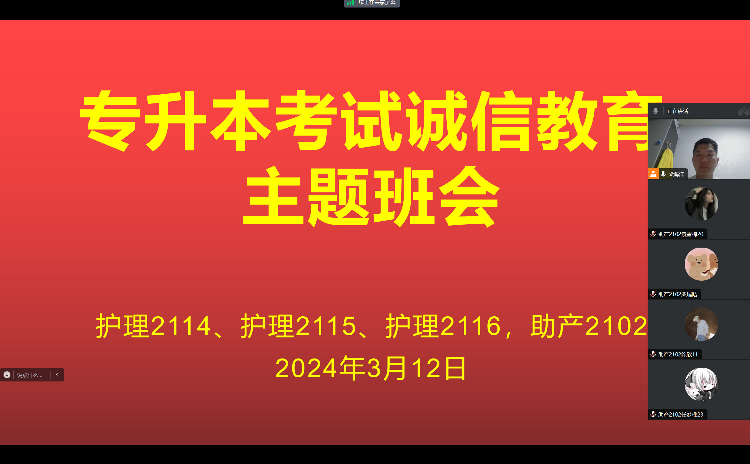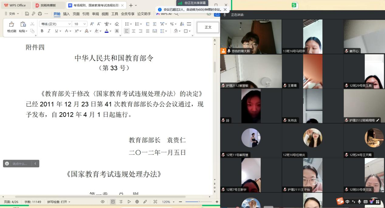 2024年专升本考试临近,为做好专升本考生考前相关工作,进一步端正考风、严肃考纪,引导考生树立诚信考试的正确价值观,今年会jinnianhui于2024年3月12-3月16日之间召开线上专升本考试诚信教育主题班会,会议由2021级辅导员主持,各班专升本考生积极参会。