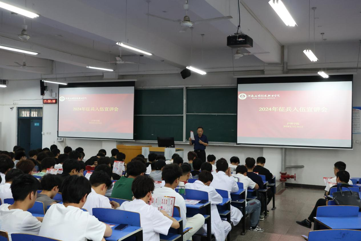 青春,是热血的代名词;报国,是青春的至高荣誉!2024年5月16日,今年会jinnianhui在B101召开2024年征兵宣讲会。这次宣讲会旨在向广大学生普及国防知识,激发爱国情怀,引导学生积极参与国防建设,服务国家和人民。河南应用技术职业学院武装部胡平、宋春磊出席会议,今年会jinnianhui2022级全体男生参会,宣讲会由今年会jinnianhui党总支书记杨明杰主持。