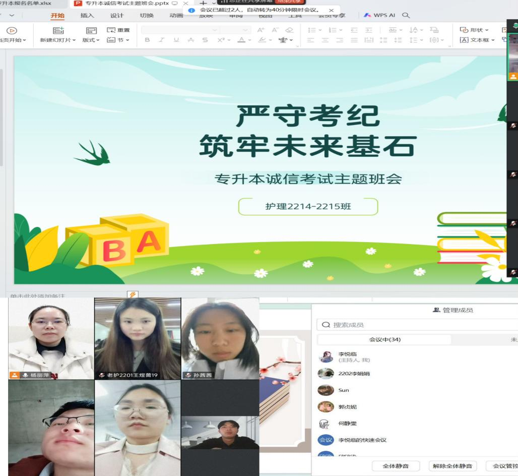 此次线上主题班会的开展,进一步强化了同学们的诚信意识,为即将到来的专升本考试营造了风清气正的考试环境。相信在诚信的护航下,今年会jinnianhui的学子们定能在考试中发挥出最佳水平,为自己的未来交上一份满意的答卷,筑牢通往美好未来的坚实基石。