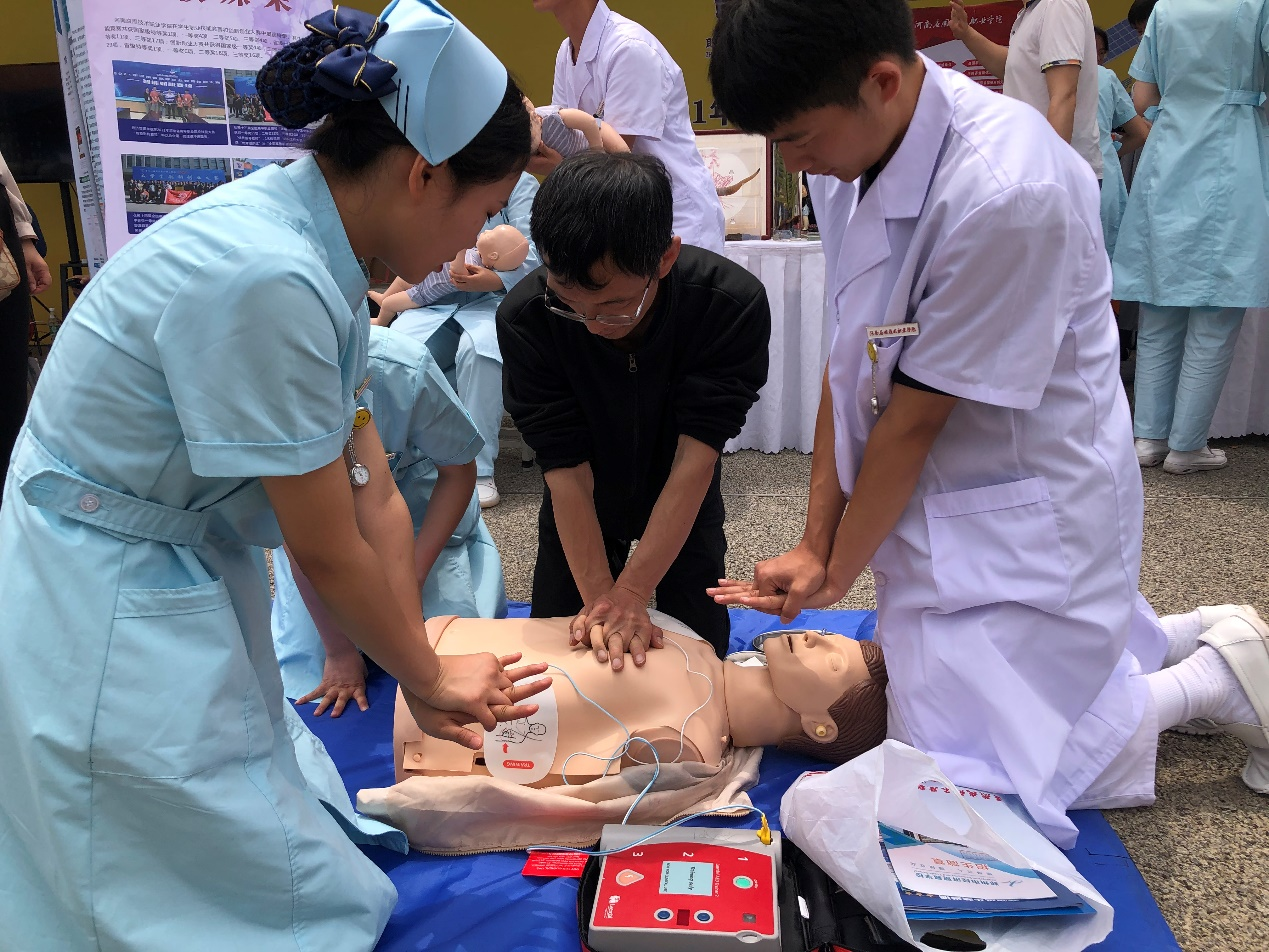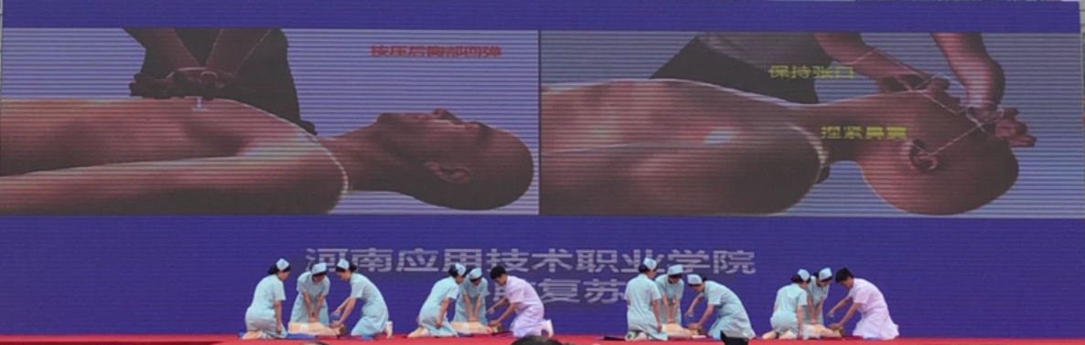 今年会jinnianhui的心肺复苏职业技能表演代表学校参加职业教育活动的舞台展演活动。在李红老师的精心指导及学生们的刻苦训练下,12名同学在激昂的音乐中展示了在心搏骤停之后黄金四分钟内的紧急救援措施——心肺复苏。舞台上,每三名同学组成救援团队分工协作,胸外心脏按压、呼吸气囊吹气、体外自动除颤有条不紊的进行,直至患者复苏成功,使现场观众切身感受到了心肺复苏的实用性和重要性。学生们有序的分工合作和整齐划一的专业动作,赢得了全场观众的热烈掌声。