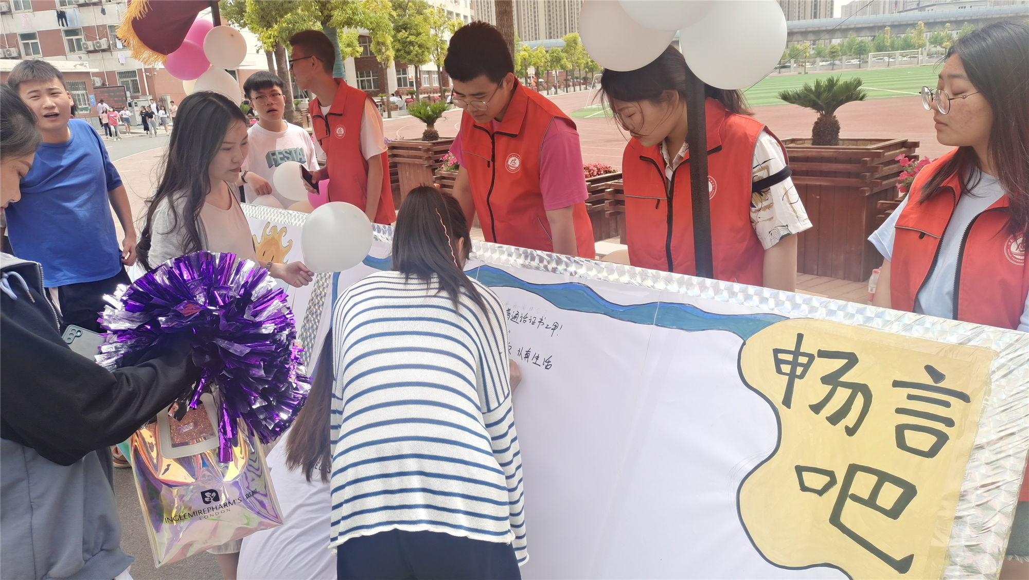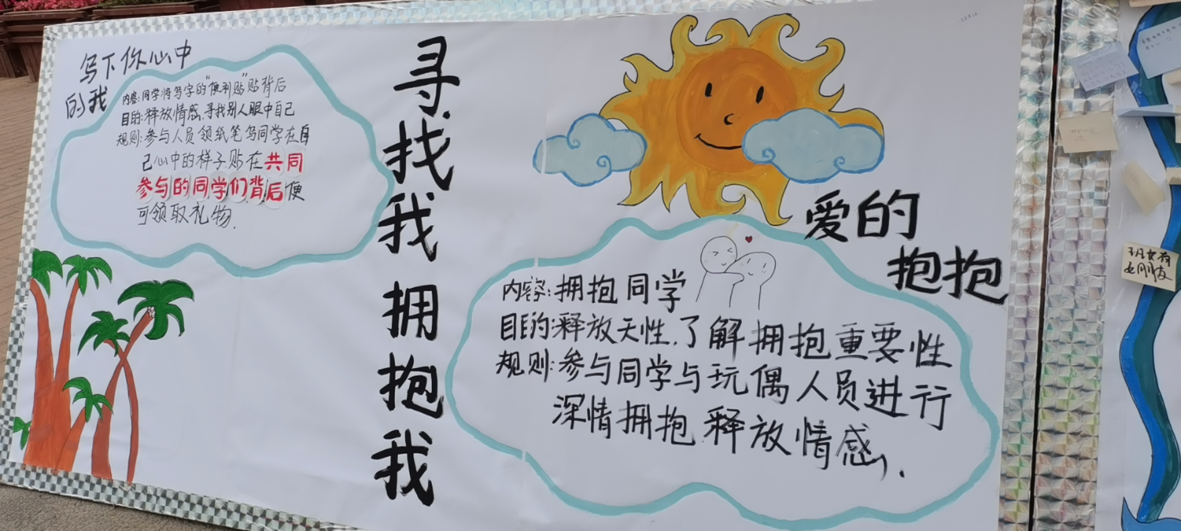 此次活动中,开展了一系列以心理健康为主题的小游戏。活动伊始,以“请在我背上留言”的游戏拉开了序幕,大家彼此之间相互留言,真挚的留言飞扬的青春活跃了现场气氛;接下来的“爱的抱抱”温暖校园游戏更是将活动推向高潮,使同学们之间更加坦诚的交流、沟通;最后赵千老师组织同学们在本次心理活动宣传主题的横幅上(展板上)签字并合影留念。
