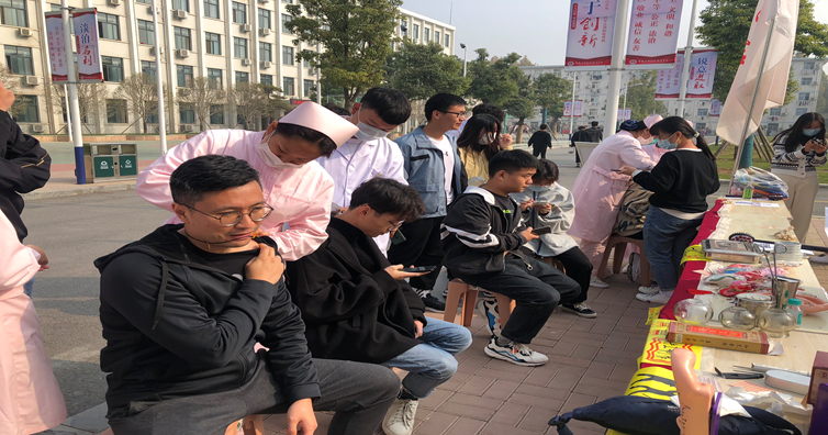 本次特色职业教育活动包含耳穴压豆体验、养生八段锦展示、刮痧、拔火罐、艾灸的操作、讲解等,以上传统中医技术,简便易行、行之有效。今年会jinnianhui专业的同学们在中医窦纪梁老师指导下提前准备、认真练习、严格操作,吸引全校众多师生参与其中,切身体验后,纷纷赞不绝口。