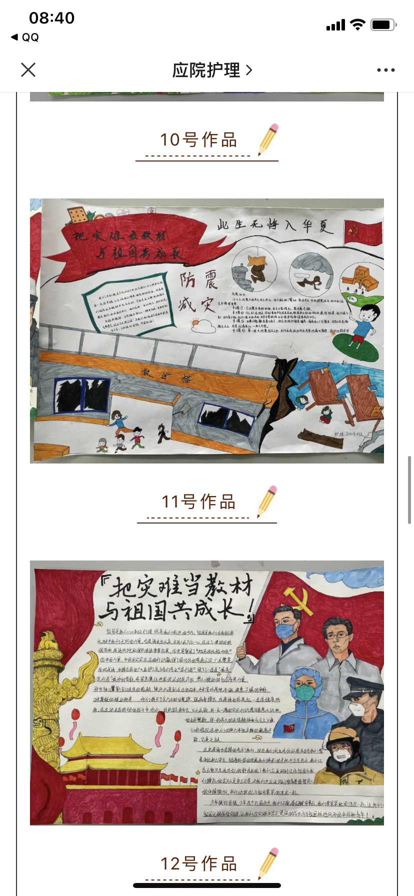学生们围绕“把灾难当教材,与祖国共成长”的主题,以图文并茂的形式,生动形象的向大家介绍校园生活中常出现的心理问题,并提供正确的解决方法。手抄报内容包括:疫情期间心理问题的疏导,校内心理问题的排解,以及如何利用护理知识治疗心理疾病等。手抄报在各班初赛筛选的基础上,共有15幅优秀参赛作品入围决赛。手抄报图片在公众号上一经展出,便吸引了广大师生积极踊跃的参与,并为自己喜欢的作品进行投票。