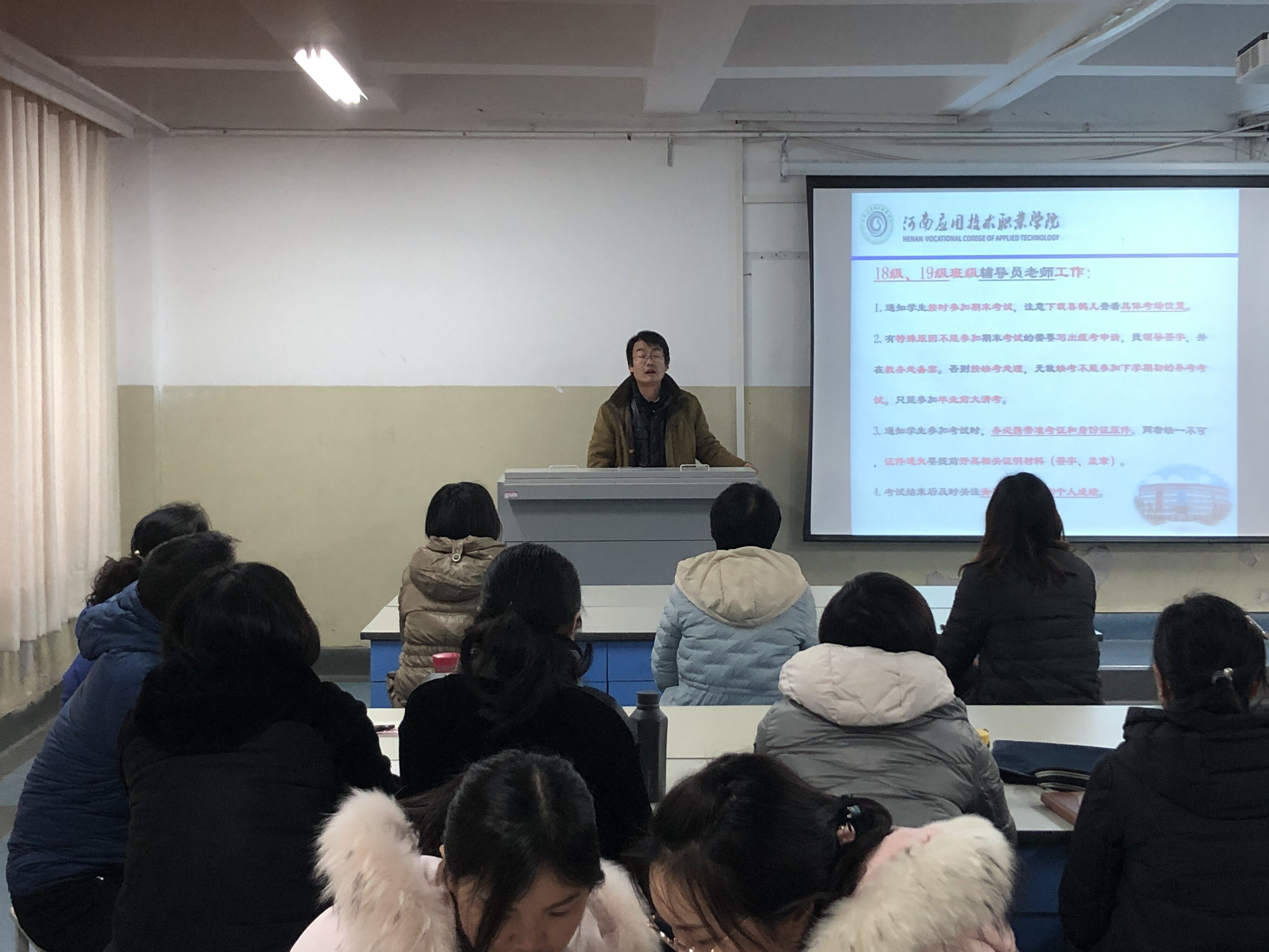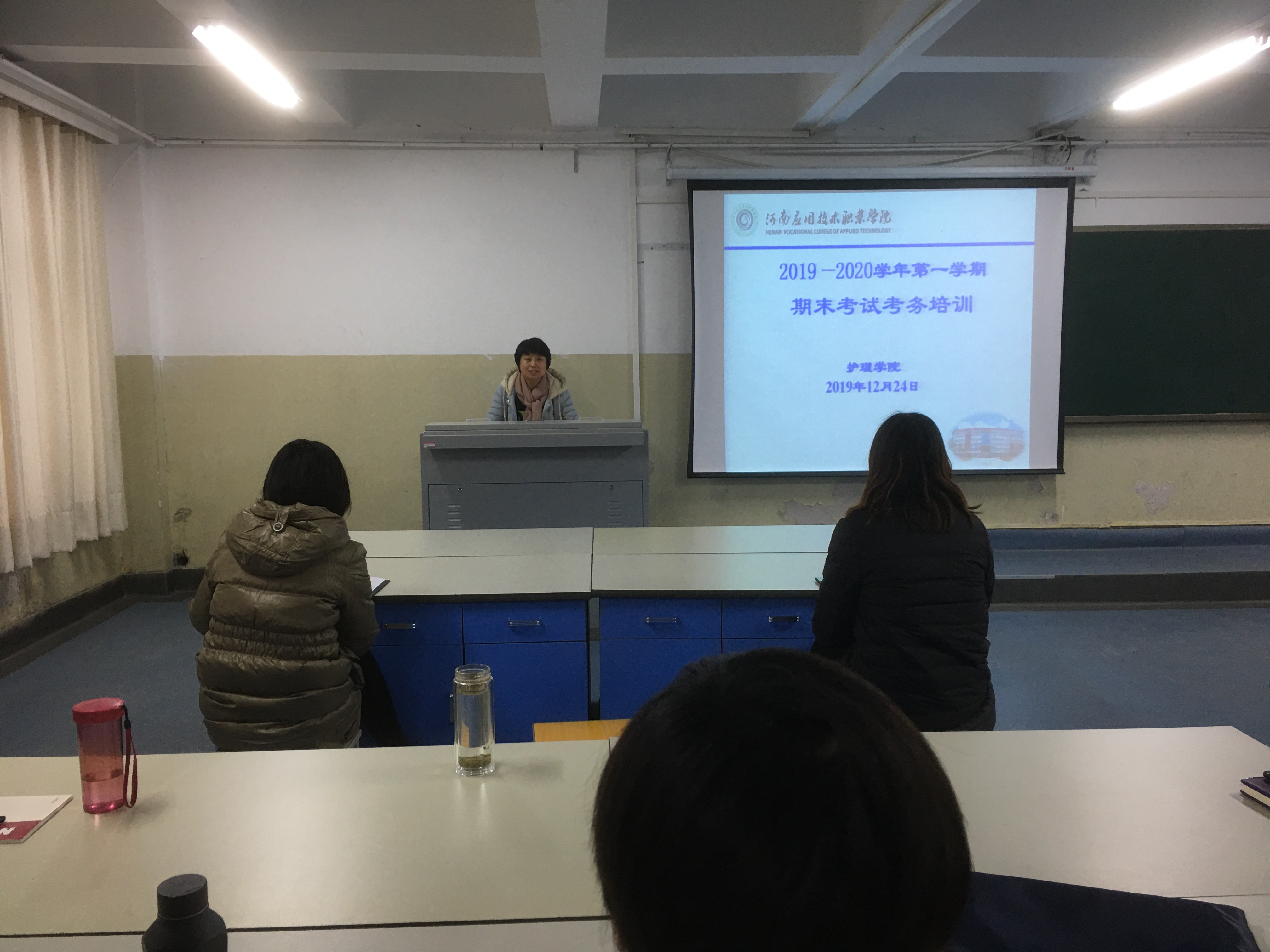 2019-2020学年第一学期期末,为了迎接即将到来的学期期末考试,加强考务管理,严肃考试纪律,规范期末考试监考工作和考务工作流程、职责。营造公平、公正的考试环境,杜绝违反考场纪律现象,保证期末考试顺利进行。根据学校教务处工作安排,2019年12月24日,今年会jinnianhui在学校D楼207室,召开期末考试考务工作培训会。陈永惠副院长主持会议,今年会jinnianhui全体教师和基础教学部部分教师出席了本次培训会议。