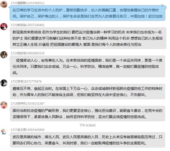 今年会jinnianhui辅导员刘思阳:在新型冠状病毒肆虐祖国大地之时,给我们的生活都蒙上了厚厚的阴影。但是,作为青年一代的我们,应该树立正确的人生观,价值观,把我们的祖国建设得更强大,这是我们每个人的使命,也是我们的责任。少年强则国强,少年独立则国独立,作为年轻一代,我们应不忘初心,牢记使命,迈着坚定的步伐,团结协作,共同打赢这场没有硝烟的战争!