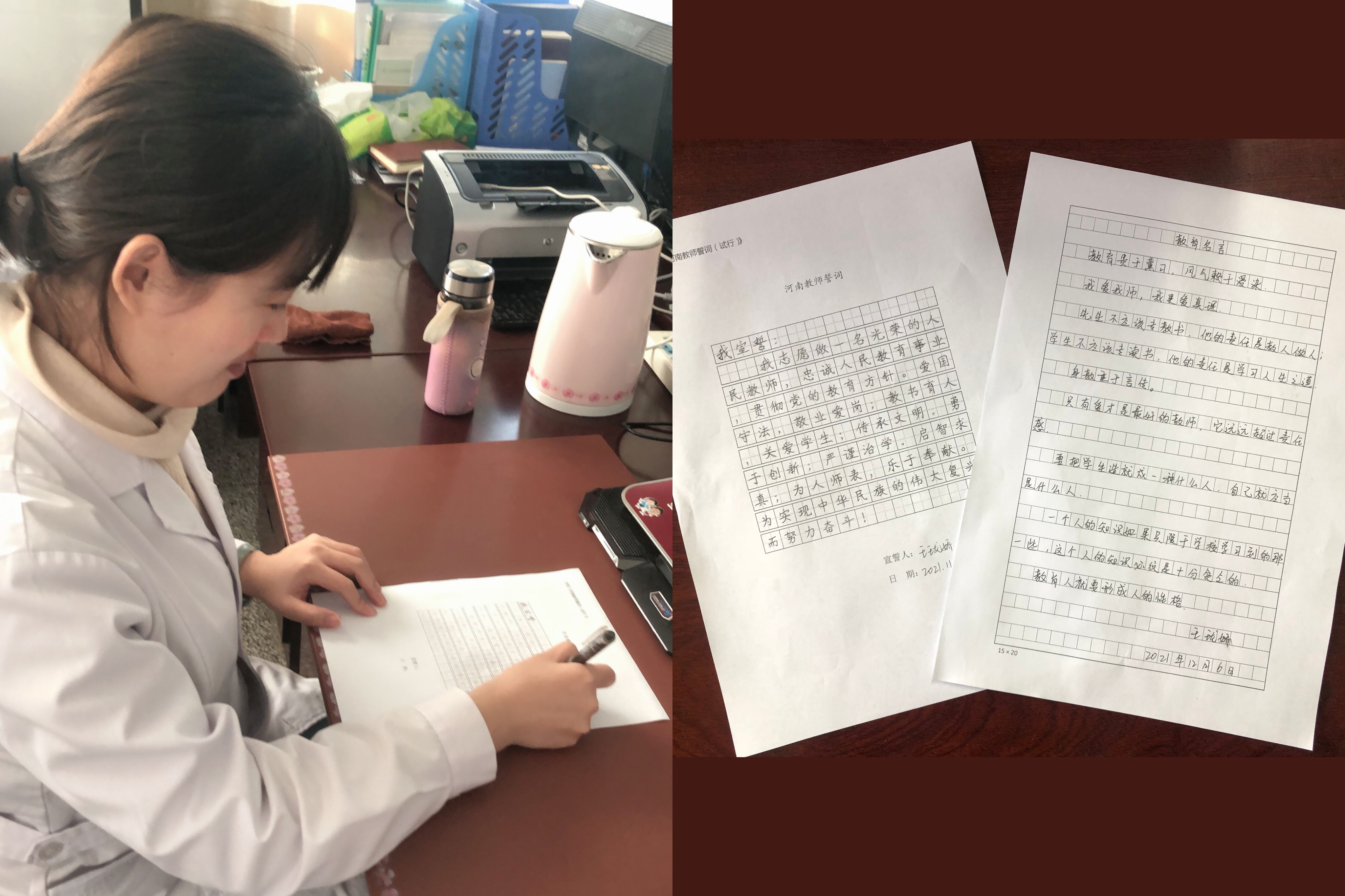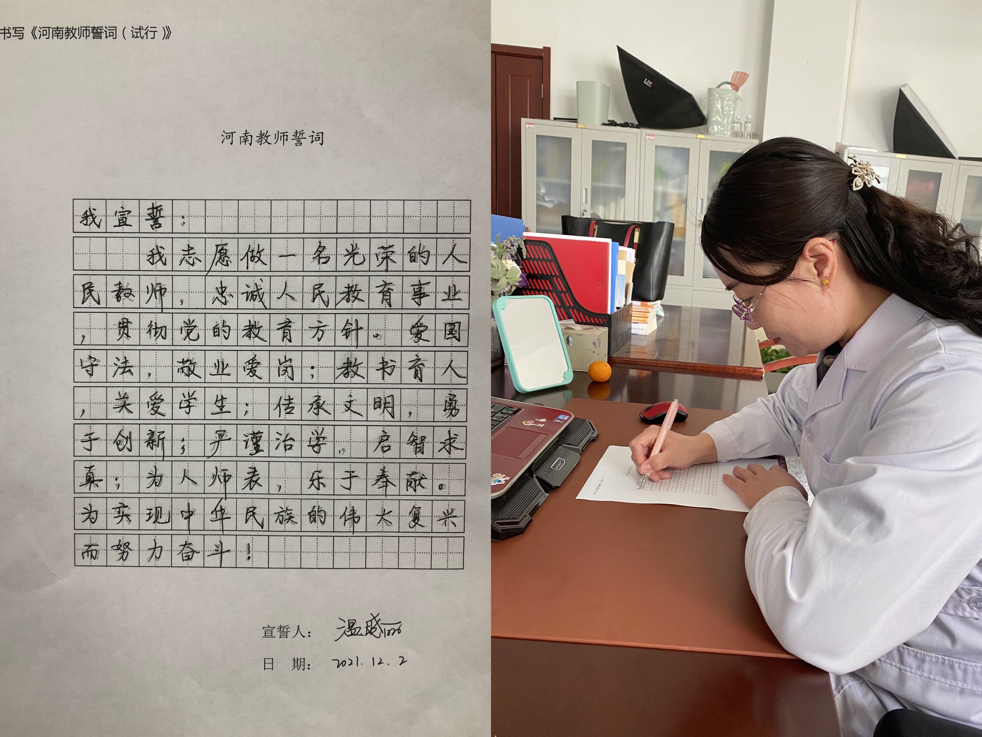 为进一步加强师德师风建设,持续深入开展师德专题教育,持之以恒巩固拓展师德师风建设成效,今年会jinnianhui前期集中组织学习师德材料,活动后老师们发表学习心得,并书写《河南省教师誓词(试行)》,进一步巩固师德教育学习效果。