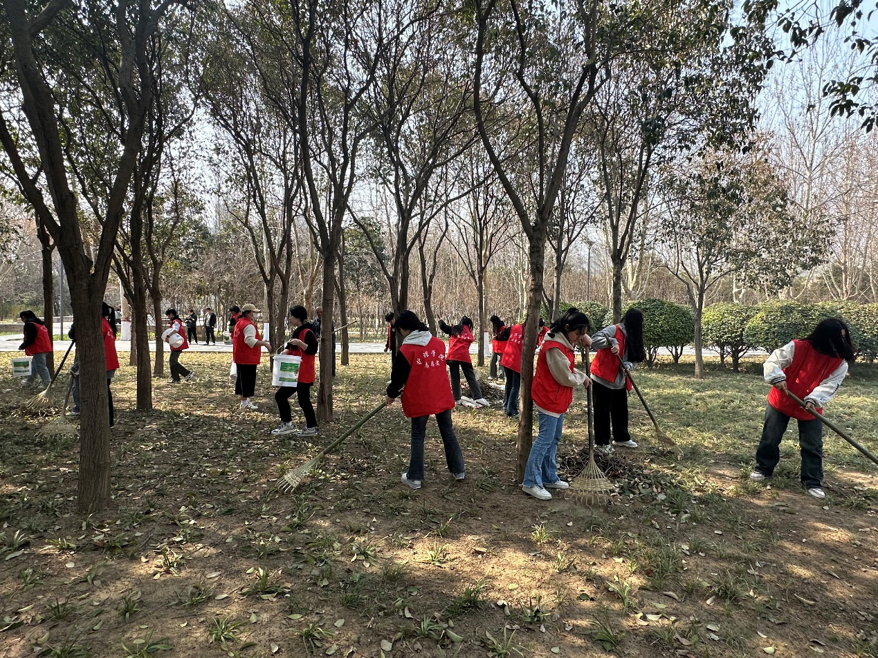 阳春三月,万物复苏,柔风和畅,春芽初萌。在植树现场,同学们三五成群,相互协作,刨树叶、洒肥料、浇水、清理垃圾,各道工序一丝不苟,整个植树现场呈现一派热火朝天的景象。经过志愿者积极有序的劳动,为郑州西流湖公园又添一抹亮丽的新绿。