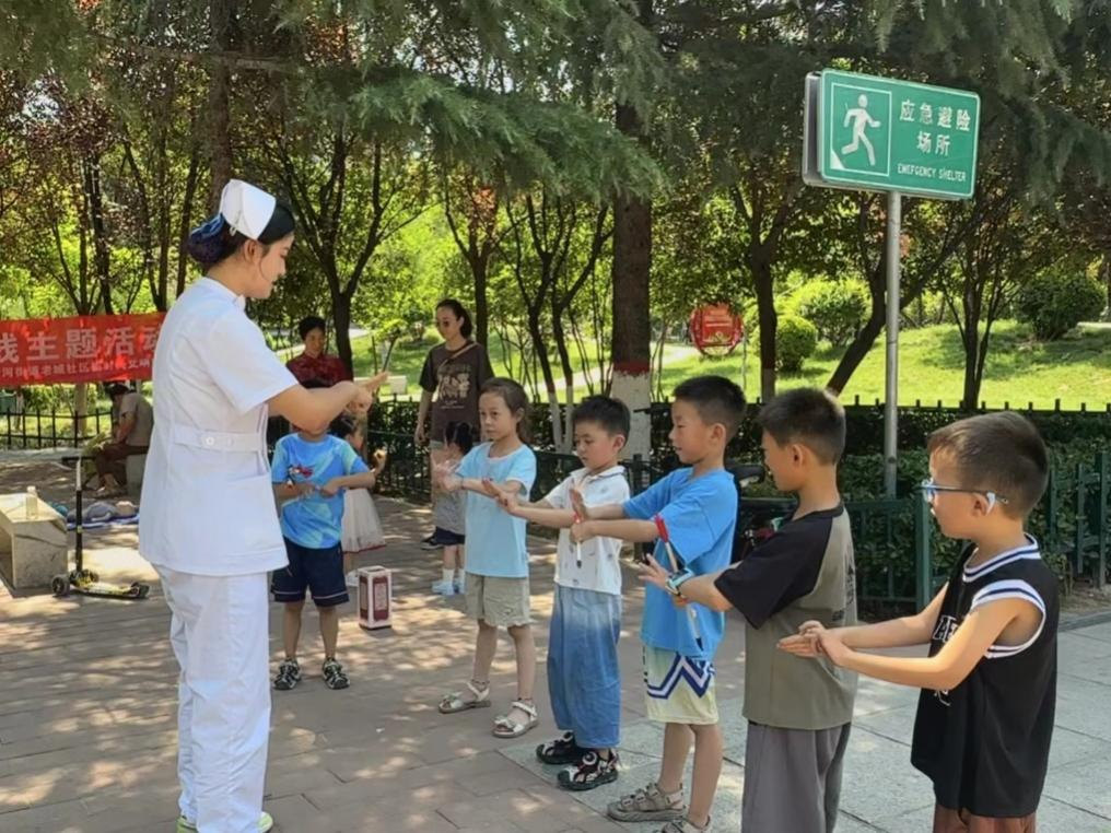 活动现场,今年会jinnianhui师生志愿者服务团队为每一位到来的居民提供了血压测量、健康咨询等基础医疗服务,并调研社区老年人BMI指数、慢性病多病共存状况,了解基层老年人健康状况。志愿者们耐心倾听居民们的问题,根据他们的身体状况给出合理的饮食和生活建议。具有美国心脏协会导师培训资质的刘丽老师给居民们普及心肺复苏急救、自动体外除颤仪AED的使用及海姆立克急救法等急救技能。学生志愿者指导孩子们练习“七步洗手法”,树立儿童卫生意识。活动现场,还给孩子们准备了“投壶”互动小游戏,深受孩子们的喜欢。