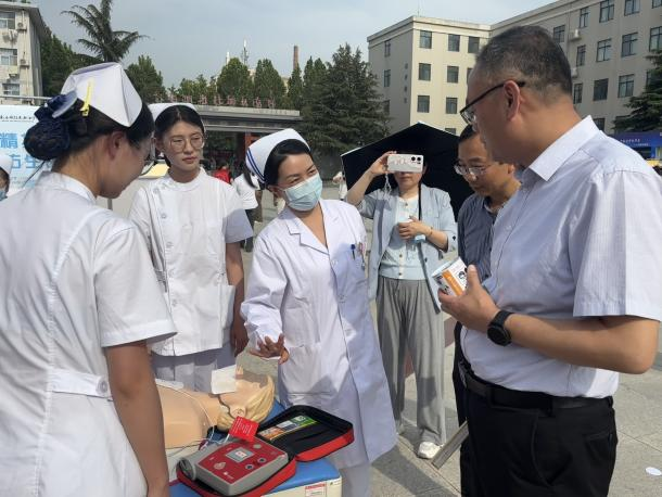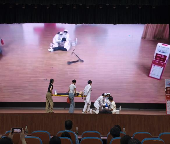 护理专业以“生命守护者”为主题,现场演示了心肺复苏术(CPR)、AED(自动体外除颤器)使用及创伤包扎,吸引众多观众驻足学习。黄校长感慨道:“这些技能关键时刻能救命,校园内也应该安装AED,不过要注意安全问题!”