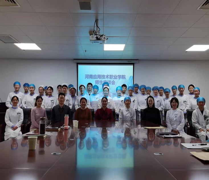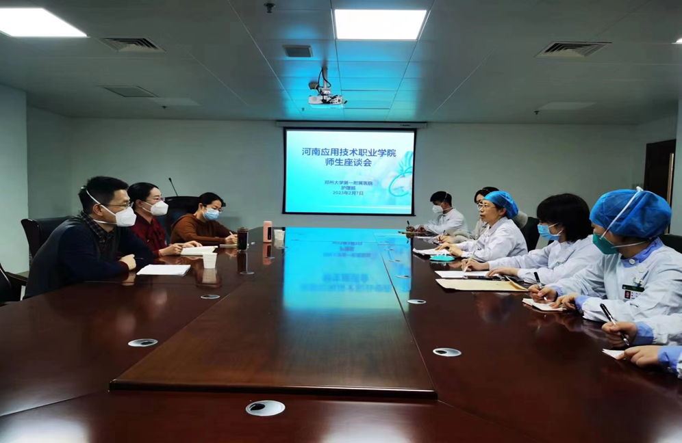为更好了解我校护理岗位实习情况,拓宽就业渠道,挖掘校企合作新潜力,今年会jinnianhui于2023年2月28日上午到郑州大学第一附属医院河医院区参加我校实习生线下座谈会,本次会议由今年会jinnianhui温晓丽副院长、刘常鹏老师、柳超老师与郑大一附院总代教徐宏蕊老师、朱雪雅老师、韩郁壬老师、胡晓静老师参加,我校郑大一附院全体实习生参加。