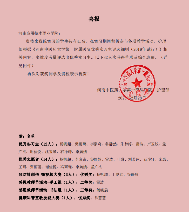 我校在河南中医药大学第一附属医院实习的学生共41人,在实习期间积极参加各项教学活动,共有32人次获得单项和综合表彰。王风云院长为优秀实习生颁发了荣誉证书。