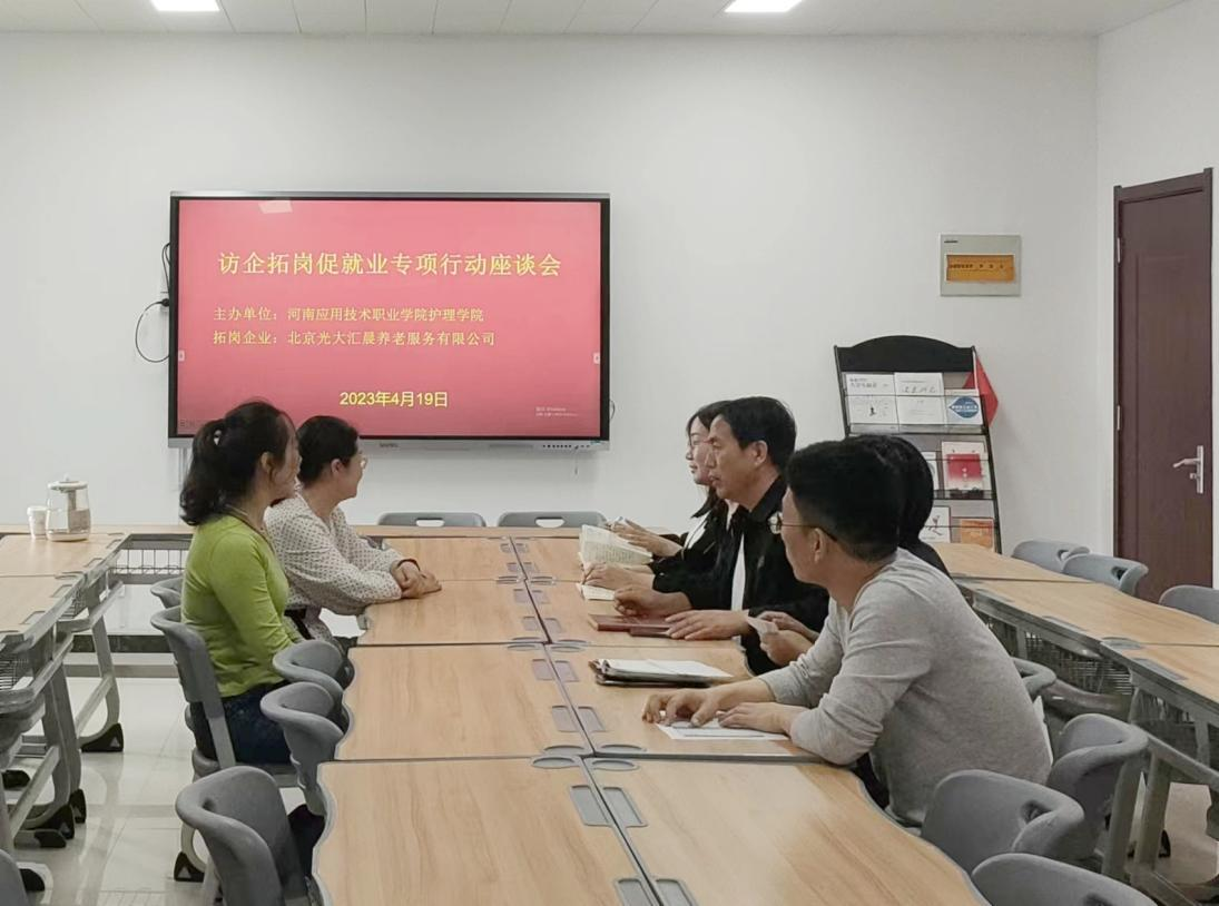 为更好促进老年保健与管理专业学生实习及就业,挖掘校企合作潜力,4月19日下午今年会jinnianhui特邀北京光大汇晨养老服务有限公司人事处主任郭杰一行来院招聘,并在行政楼515针对访企拓岗促就业进行深入交流,今年会jinnianhui党总支书记杨明杰、副院长温晓丽、党总支副书记景淼等人与会。
